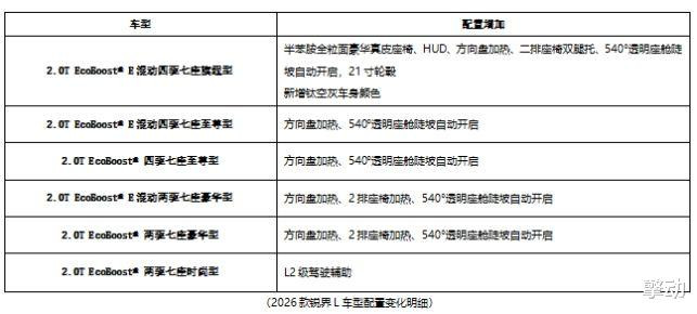 承载着消费者对大家庭出游的更高期待,2026款福特锐界L近日惊喜亮相。新车带来豪华、舒适、安全、智能四大升级,高配新增“2.0T E混动旗舰型”搭载百万级豪车同款“半苯胺全粒面豪华真皮座椅”,中配起增加方向盘加热和二排座椅加热,540°透明座舱新增陡坡自动开启功能,全系搭载L2级驾驶辅助。新车预计将于9月底正式上市。